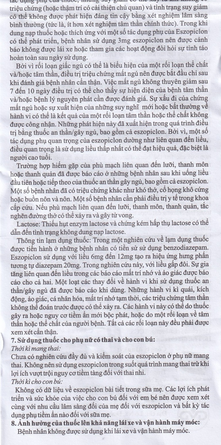 Việc mất ngủ không thuyên giảm sau 7 đến 10 ngày điều trị có thể cho thấy sự hiện diện của bệnh tâm thần và/hoặc bệnh lý nguyên phát cần được đánh giá. Sự xấu đi của chứng mất ngủ hoặc sự xuất hiện của những suy nghĩ mới hoặc bất thường về hành vi có thể là kết quả của một rối loạn tâm thần hoặc thể chất không được công nhận. Những phát hiện này đã xuất hiện trong quá trình điều trị bằng thuốc an thần/gây ngủ, bao gồm cả eszopiclon.