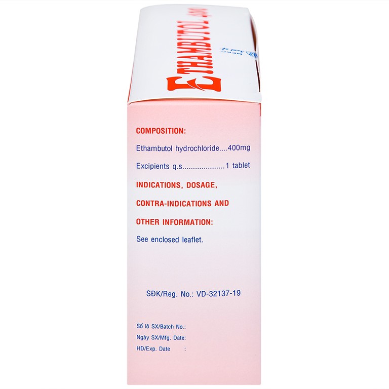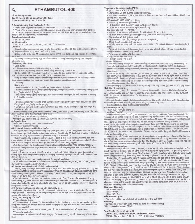 Thuốc Ethambutol 400mg dùng đường uống. Thuốc có thể uống cùng với thức ăn nếu bị kích ứng đường tiêu hóa. Có thể nghiền viên thuốc thành bột, trộn với nước ép táo, không trộn với các nước ép khác hoặc siro khác vì không làm mất vị đắng hoặc không ổn định.