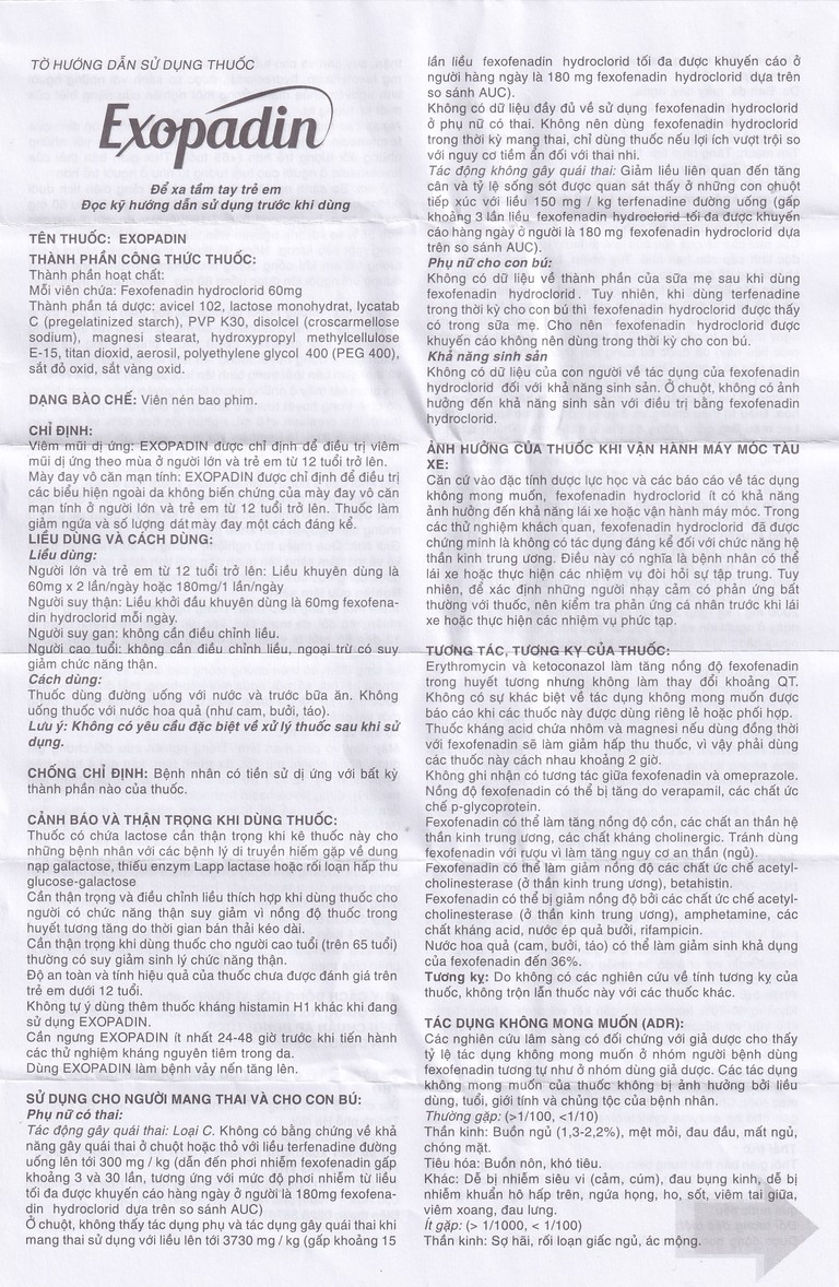 Viêm mũi dị ứng: Exopadin được chỉ định để điều trị viêm mũi dị ứng theo mùa ở người lớn và trẻ em từ 12 tuổi trở lên.