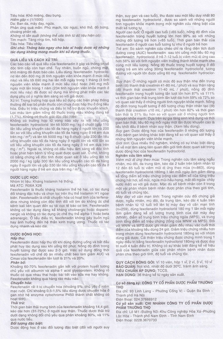 Mày đay vô căn mạn tính: Trong nghiên cứu đối chứng giả dược, ngẫu nhiên, mù đôi, đa trung tâm, kéo dài 4 tuần trên bệnh nhân từ 12 tuổi trở lên bị mày đay vô căn mạn tính (n=259), dùng fexofenadin hydroclorid 180 mg 1 lần mỗi ngày làm giảm đáng kể số lượng trung bình của dát mày đay (MNW), điểm số trung bình triệu chứng ngứa (MPS), và trung bình tổng điểm số triệu chứng (tổng của MNW và MPS). Đối với MNW và MPS được ghi nhận giảm đều nhau vào cuối thời điểm của khoảng liều dùng 24 giờ. Giảm triệu chứng nhiều hơn trong nhóm dùng fexofenadin hydroclorid 180mg so với nhóm dùng giả dược. Cải thiện triệu chứng được chứng minh trong 1 ngày điều trị bằng fexofenadin hydroclorid 180mg và được duy trì suốt 4 tuần điều trị. Không có sự khác biệt đáng kể về hiệu quả của fexofenadin giữa các phân nhóm bệnh nhân được phân chia theo giới tính, độ tuổi và chủng tộc.
