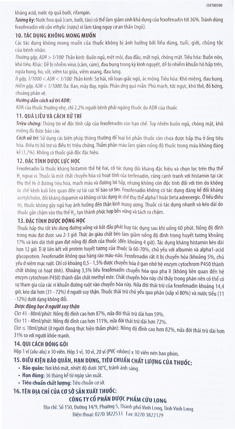 Thuốc là một chất chuyển hóa có hoạt tính của terfenadin, cũng cạnh tranh với histamin tại các thụ thể H1 ở đường tiêu hóa, mạch máu và đường hô hấp, nhưng không còn độc tính đối với tim do không