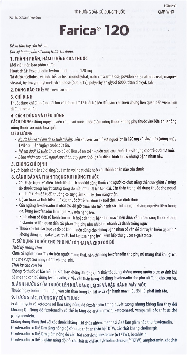 Farica 120mg chỉ định điều trị ở người lớn và trẻ em từ 12 tuổi trở lên để giảm các triệu chứng liên quan đến viêm mũi dị ứng theo mùa.