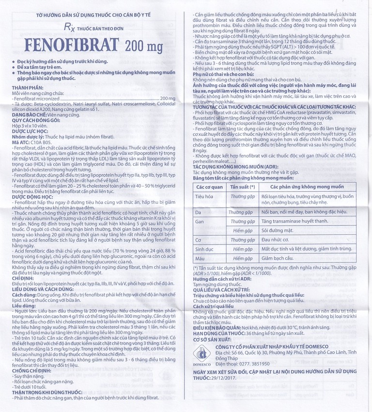 Thuốc Fenofibrate 200mg Domesco điều trị rối loạn lipoprotein huyết (3 vỉ x 10 viên)