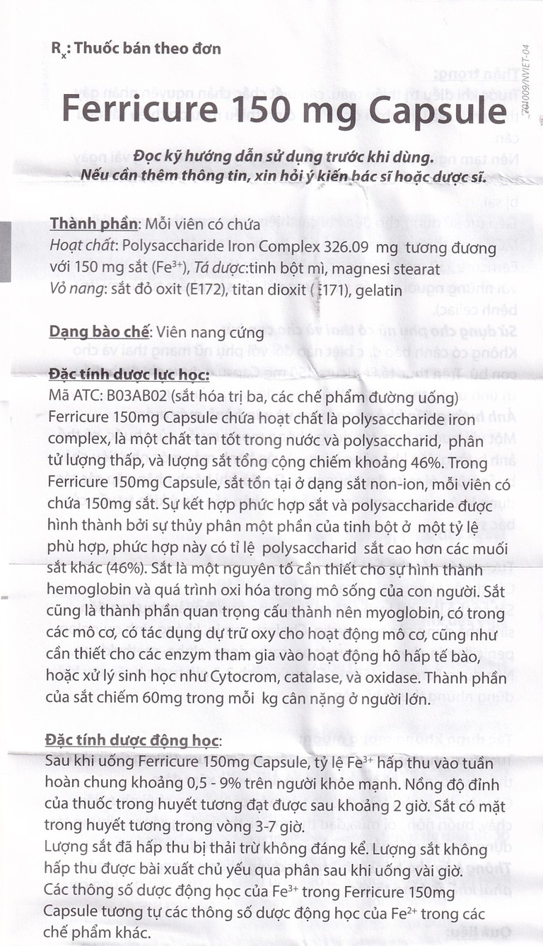 - Tương tự như tất cả các dạng muối sắt, Ferricure 150mg có thể gây đổi màu phân thành màu đen hoặc xám đậm.