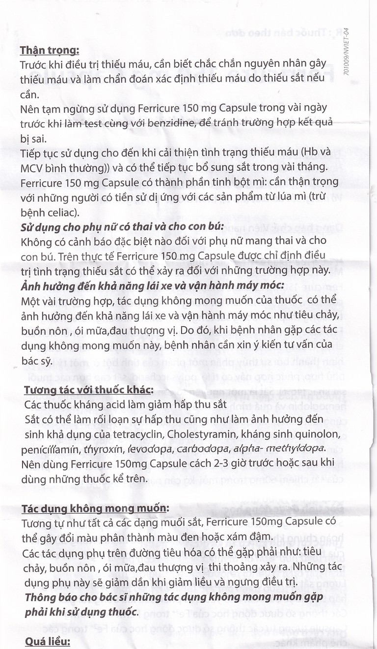 Tiếp tục sử dụng cho đến khi cải thiện tình trạng thiếu máu (Hb và MCV bình thường) và có thể tiếp tục bổ sung sắt trong vài tháng. Ferricure 150mg Capsule có thành phần tinh bột mì: Cần thận trọng với những người có tiền sử dị ứng với các sản phẩm từ lúa mì (trừ bệnh celiac).