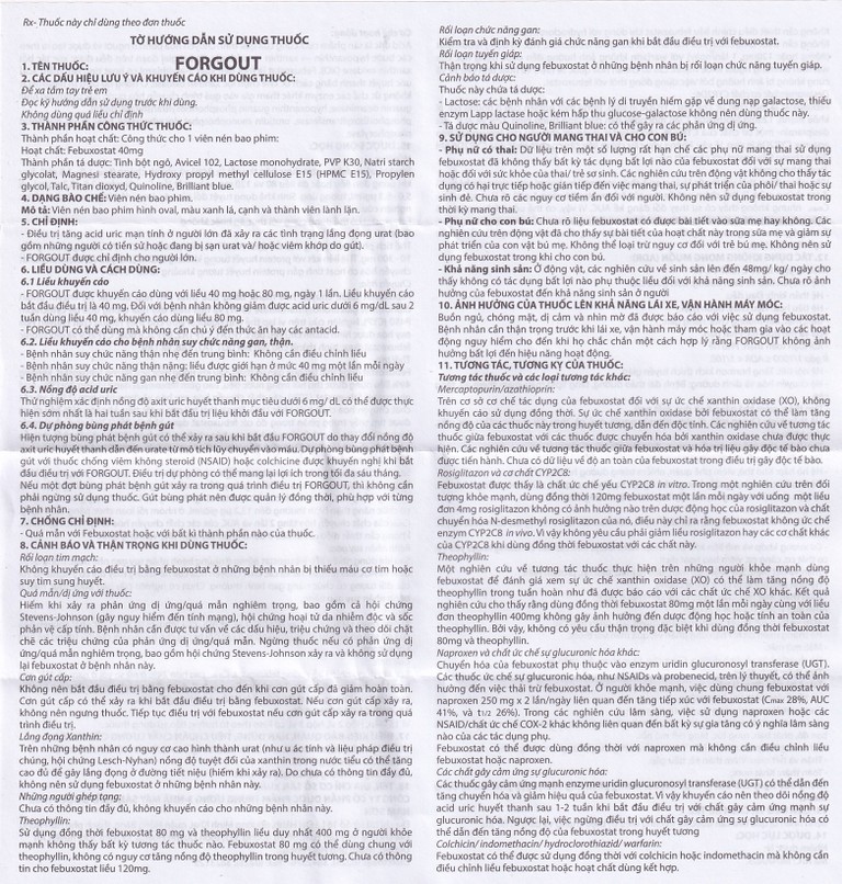 Nếu một đợt bùng phát bệnh gút xảy ra trong quá trình điều trị Forgout, thì không cần phải ngừng sử dụng thuốc. Gút bùng phát nên được quản lý đồng thời, phù hợp với từng bệnh nhân.