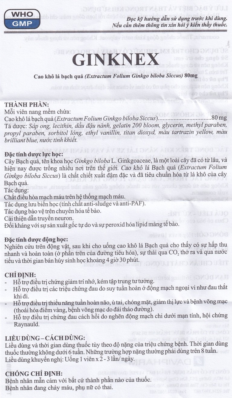 Thuốc Ginknex 80mg Davipharm hỗ trợ điều trị chứng giảm trí nhớ, kém tập trung tư tưởng (6 vỉ x 10 viên)