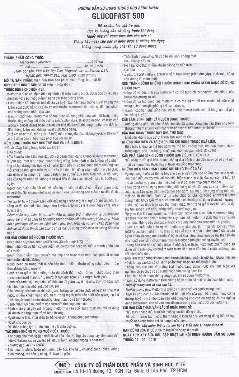 Thuốc Glucofast 500mg Mebiphar điều trị tiểu đường típ 2 (4 vỉ x 15 viên)