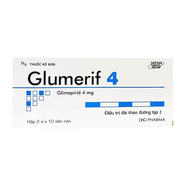 Thuốc Glumerif 4 được sản xuất bởi Công ty Cổ phần Dược Hậu Giang, có thành phần chính là Glimepirid, được chỉ định để điều trị bệnh đái tháo đường týp 2 (không phụ thuộc insulin) ở người lớn sau khi đã áp dụng chế độ ăn kiêng, tập thể dục và giảm cân nặng nhưng nồng độ đường huyết vẫn không trở về mức bình thường. Glimepirid có thể dùng phối hợp với metformin hoặc với glitazon hoặc với insulin.