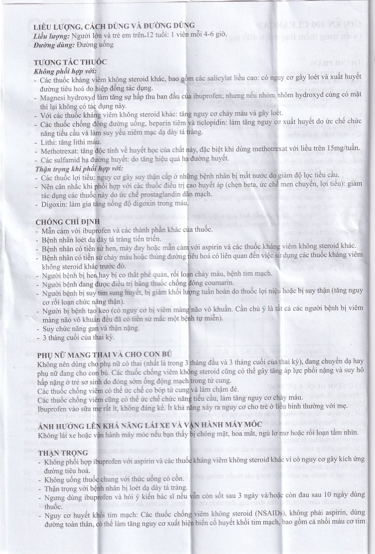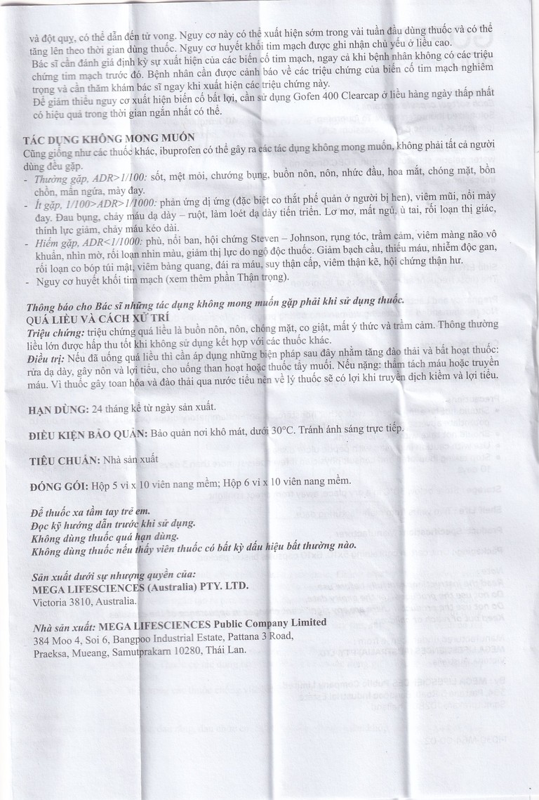 Bệnh nhân cần được cảnh báo về các triệu chứng của biến cố tim mạch nghiêm trọng và cần thăm khám bác sĩ ngay khi xuất hiện các triệu chứng này. Để giảm thiểu nguy cơ xuất hiện biến cố bất lợi, cần sử dụng Gofen 400 ở liều hàng ngày thấp nhất có hiệu quả trong thời gian ngắn nhất có thể.