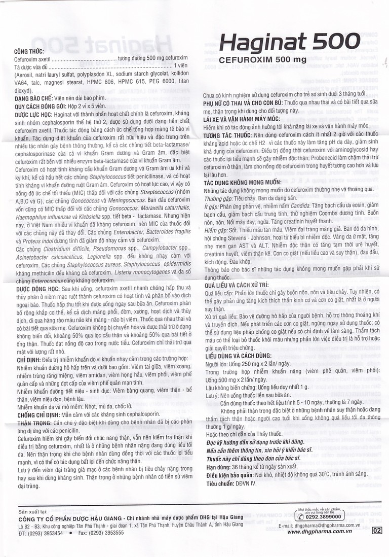 Haginat 500 với thành phần hoạt chất chính là Cefuroxim, kháng sinh nhóm Cephalosporin thế hệ thứ 2, được sử dụng dưới dạng tiền chất Cefuroxim Axetil.