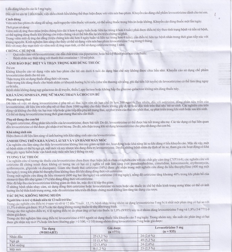 Trẻ em: Không khuyến cáo sử dụng viên nén bao phim cho trẻ em dưới 6 tuổi do dạng bào chế này không chia được liều nhỏ. Khuyến cáo sử dụng levocetirizine dành cho trẻ em.