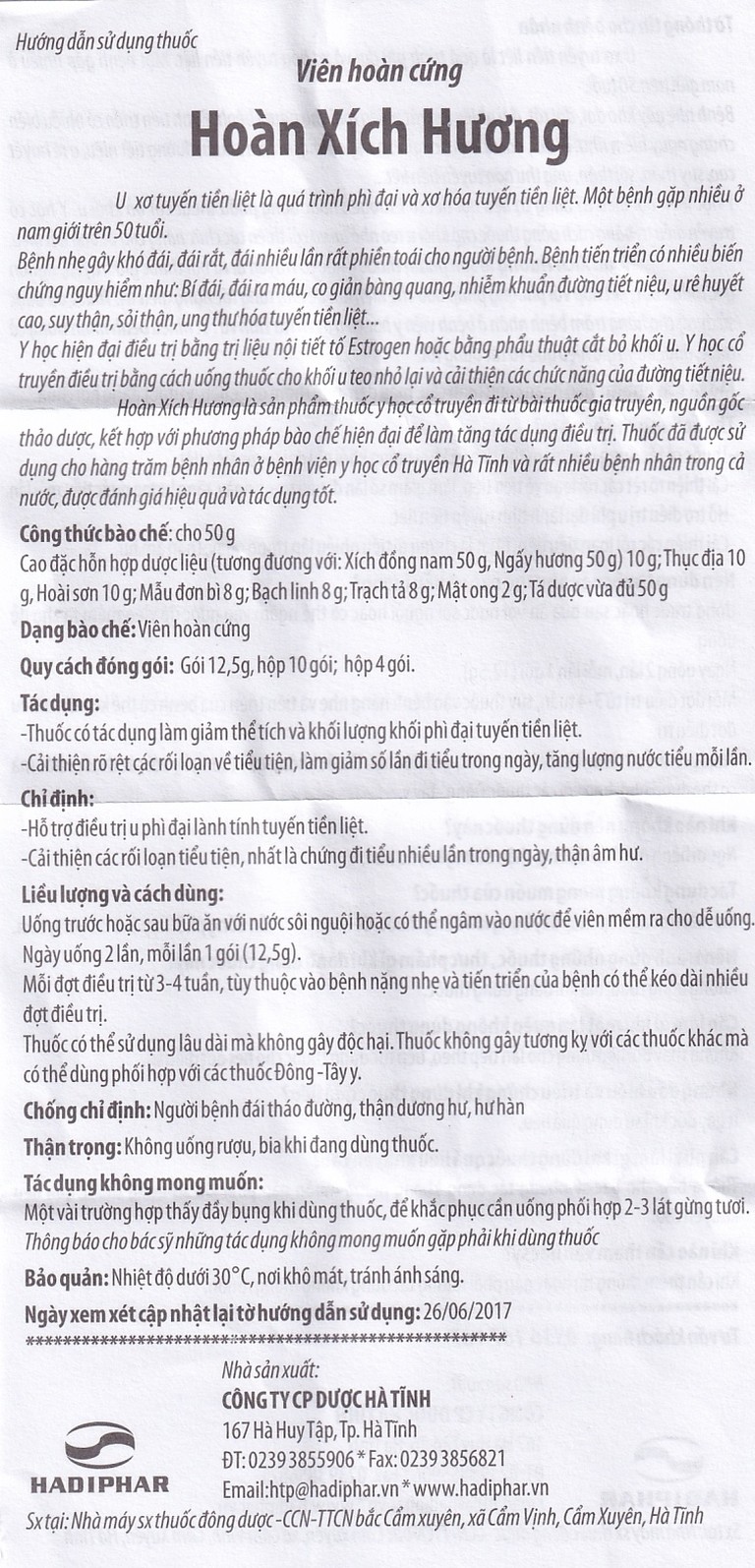 Thuốc Hoàn Xích Hương Hadiphar điều trị u phì đại lành tính tuyến tiền liệt (10 gói)
