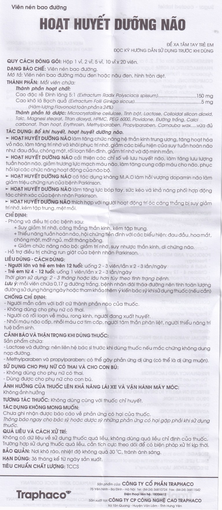 Hoạt huyết dưỡng não Traphaco bao đường được dùng đường uống.