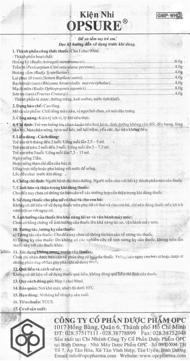 Thuốc Kiện nhi Opsure là sản phẩm của công ty cổ phần dược phẩm OPC, thành phần chính bao gồm hoàng kỳ, trần bì, hoàng cầm, lai phục tử (sao), bạch truật (sao), mạch môn, sơn tra (sao), là thuốc dùng cho trẻ biếng ăn.