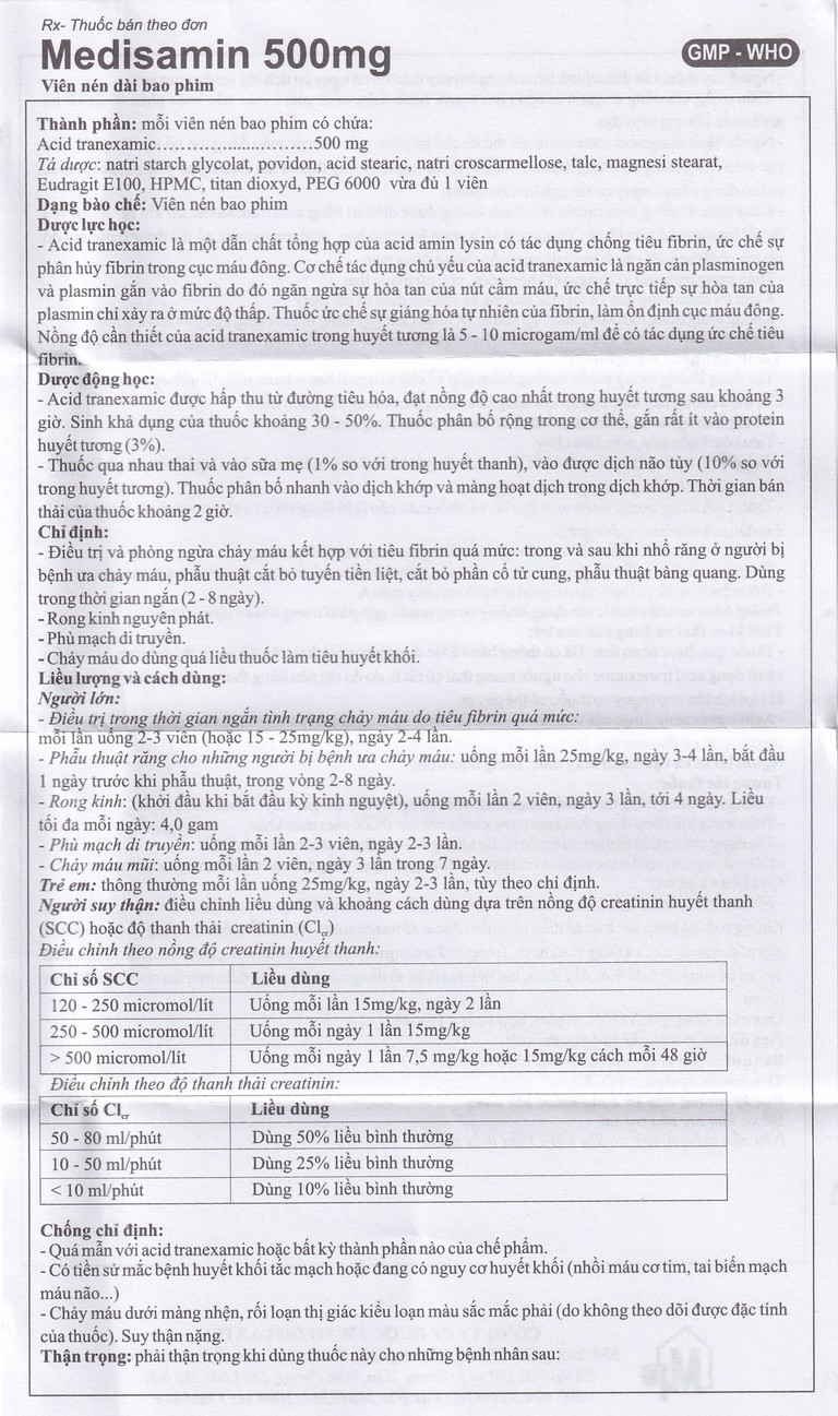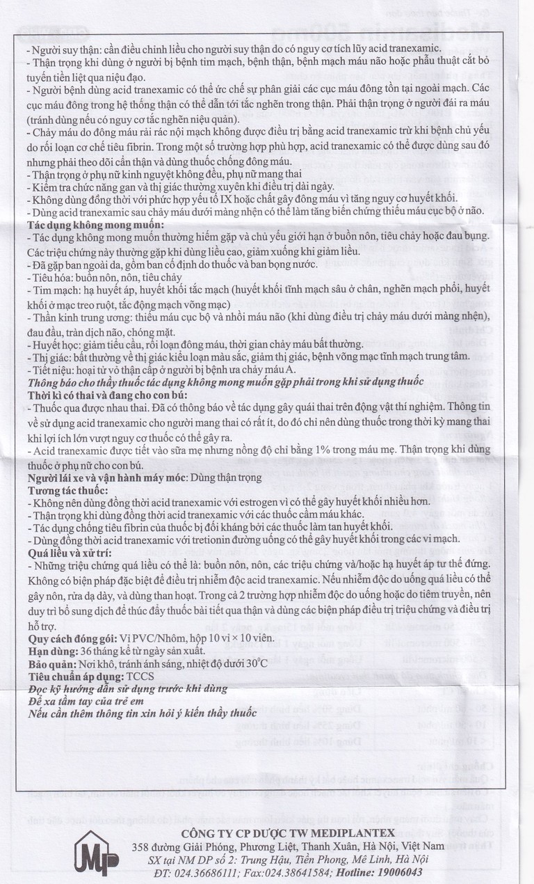 Thuốc Medisamin 500mg Mediplantex điều trị chảy máu ở bệnh ưa chảy máu, rong kinh (10 vỉ x 10 viên)