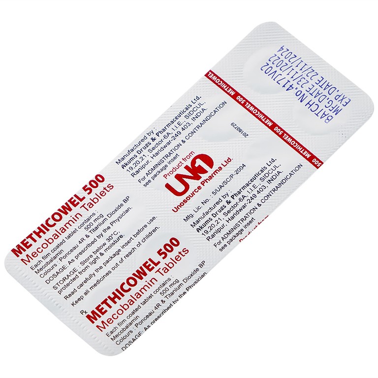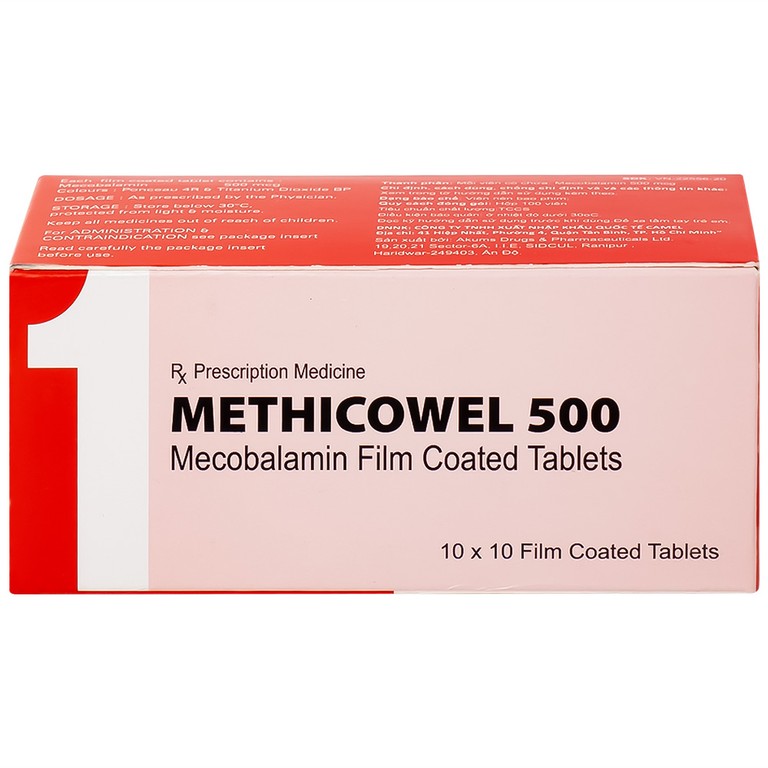 Thuốc Methicowel 500 Akums điều trị các bệnh lý thần kinh ngoại biên, thiếu máu hồng cầu to (10 vỉ x 10 viên)