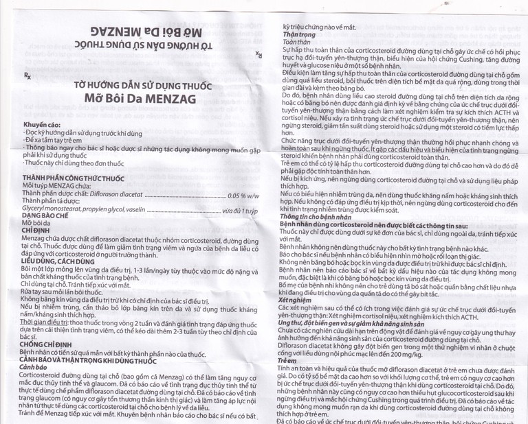 Thuốc mỡ bôi da Menzag là sản phẩm chứa hoạt chất Diflorason diacetate 0.05% w/w thuộc nhóm corticosteroid, đường dùng tại chỗ. Thuốc được dùng để làm giảm tình trạng viêm và ngứa của bệnh da liễu có đáp ứng với corticosteroid ở người trưởng thành.