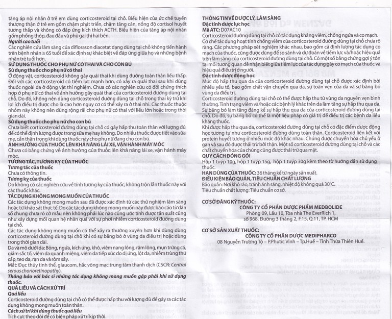 Thời gian điều trị: Thoa thuốc trong vòng 2 tuần và đánh giá tình trạng đáp ứng thuốc dựa trên cải thiện tình trạng viêm, có thể kéo dài thêm 2 – 3 tuần tùy theo chỉ định của bác sĩ.