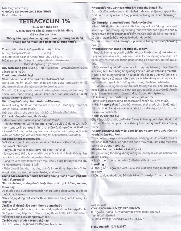 Công dụng của Thuốc mỡ tra mắt Tetracyclin 1%