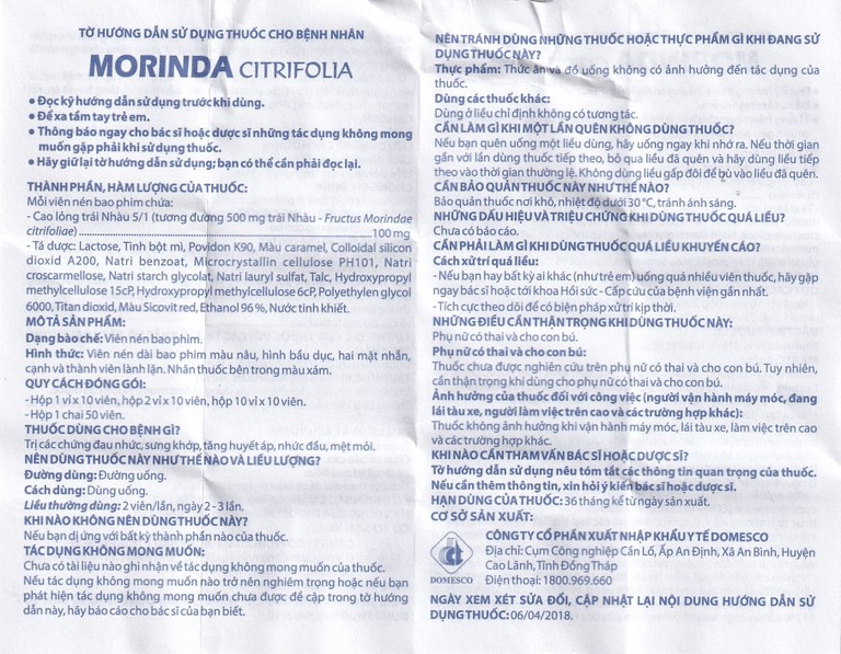 Thuốc Morinda Citrifolia Domesco điều trị đau nhức, sưng khớp, tăng huyết áp (50 viên)SẢN PHẨM