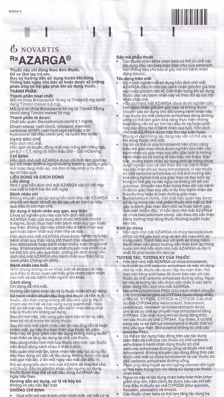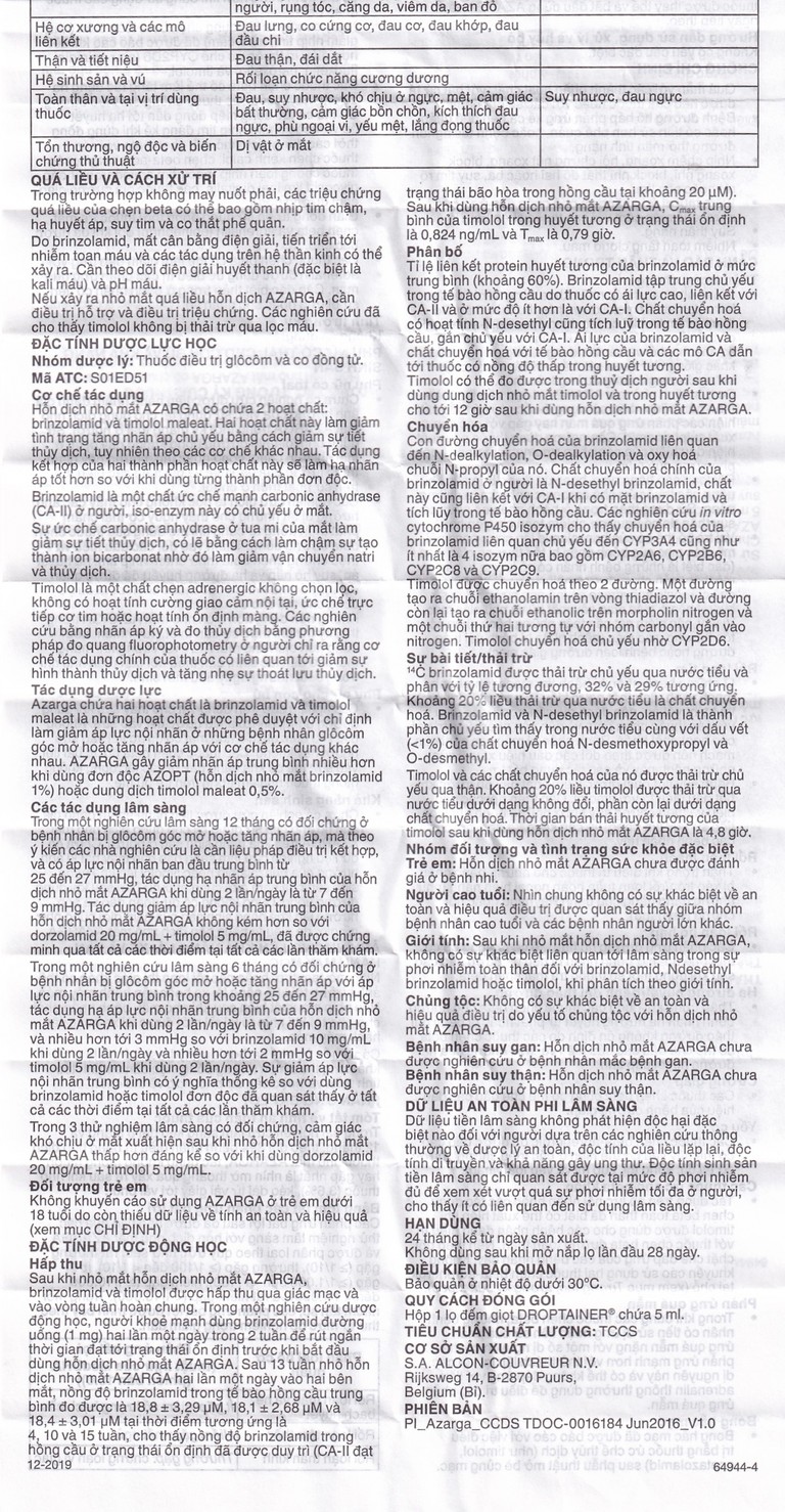 Hấp thu: Sau khi nhỏ mắt hỗn dịch nhỏ mắt Azarga, hoạt chất brinzolamid và timolol được hấp thu qua giác mạc và vào vòng tuần hoàn chung.