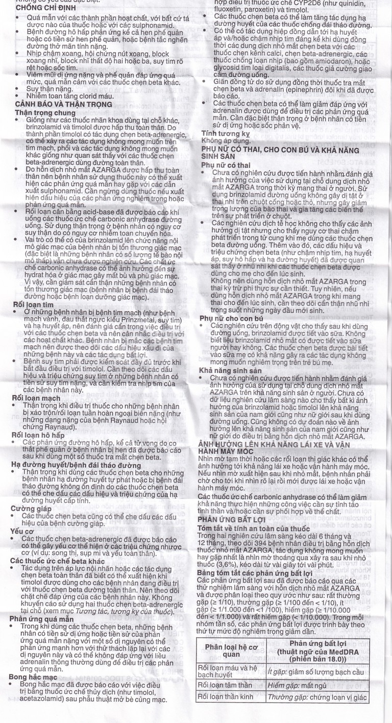 Hỗn dịch nhỏ mắt Azarga có chứa brinzolamid, một chất ức chế carbonic anhydrase và mặc dù dùng nhỏ tại mắt, thuốc vẫn được hấp thu toàn thân. Rối loạn cân bằng acid-base đã được báo cáo với các thuốc ức chế carbonic anhydrase đường uống. Nguy cơ xảy ra tương tác cần được cân nhắc ở các bệnh carbonic anhydrase đường uống.