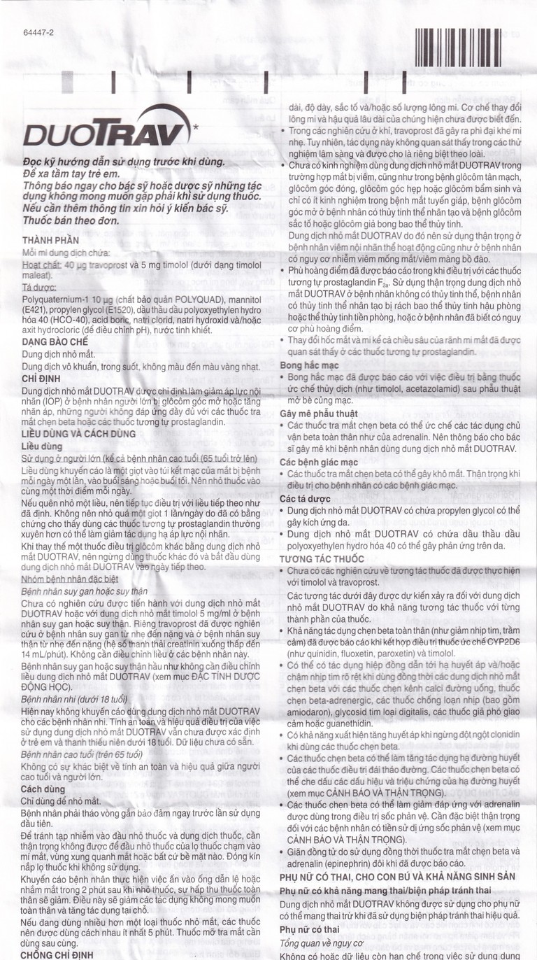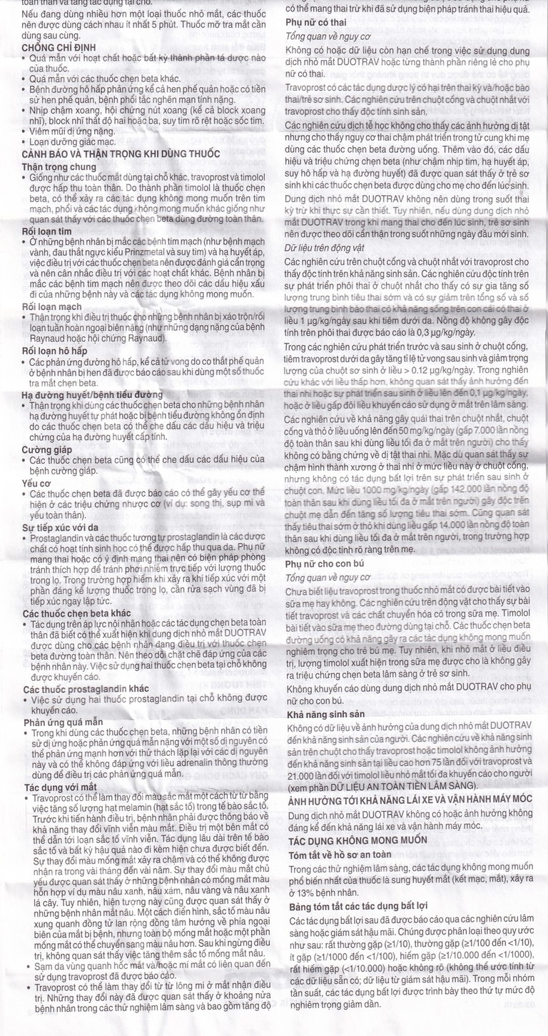 Chưa có kinh nghiệm dùng Duotrav trong trường hợp mắt bị viêm, bệnh glaucoma tân mạch, glaucoma góc đóng, glaucoma góc hẹp hoặc glaucoma bẩm sinh và chỉ có ít kinh nghiệm trong bệnh mắt tuyến giáp, bệnh glaucoma góc mở ở bệnh nhân có thủy tinh thể nhân tạo và bệnh glaucoma sắc tố hoặc glaucoma giả bong bao thể thủy tinh. Do đó nên sử dụng thận trọng ở bệnh nhân viêm nội nhãn thể hoạt động cũng như bệnh nhân có nguy cơ nhiễm viêm mống mắt/viêm màng bồ đào.