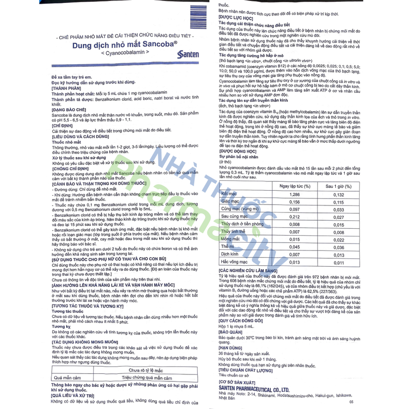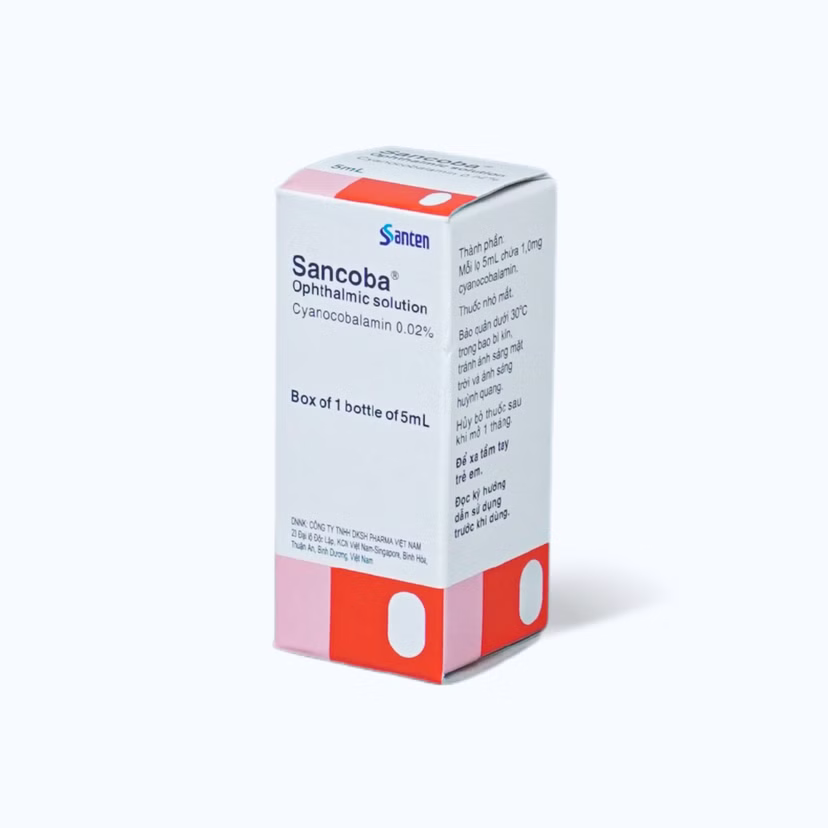 Dung dịch nhỏ mắt Sancoba được sản xuất bởi Công ty Santen Pharmaceutical Co, Ltd – Nhật Bản, có thành phần chính là cyanocobalamin. Dung dịch nhỏ mắt Sancoba được sử dụng trong trường hợp cải thiện sự dao động về điều tiết trong chứng mỏi mắt do điều tiết.