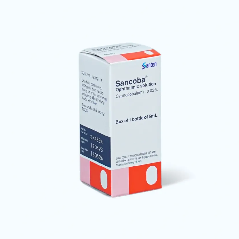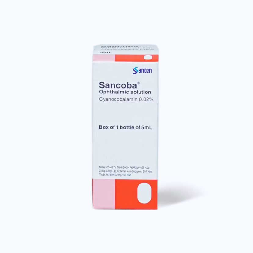 Thuốc nhỏ mắt Sancoba 0.02% được bào chế dưới dạng dung dịch nhỏ mắt với dung dịch thân nước vô khuẩn, trong suốt, màu đỏ. Hộp 1 lọ nhựa 5ml.