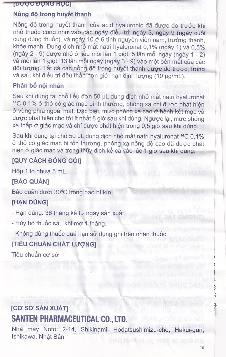 Nồng độ trong huyết thanh của acid hyaluronic đã được đo trước khi nhỏ thuốc cũng như vào các ngày điều trị: ngày 3, ngày 9 (ngày cuối cùng dùng thuốc), và ngày 10 ở 6 tình nguyện viên nam, trưởng thành, khỏe mạnh. Dung dịch nhỏ mắt natri hyaluronate 0,1% (ngày 1), và 0,5% (ngày 2 – 9) được nhỏ ở liều mỗi lần 1 giọt, 5 – 6 lần/ngày (ngày 1 – 2) và mỗi lần 1 giọt, 13 lần mỗi ngày (ngày 3 – 9) vào một bên mắt của các đối tượng. Tất cả các nồng độ trong huyết thanh được đo trước, trong và sau khi điều trị đều thấp hơn giới hạn định lượng (10 µg/mL).