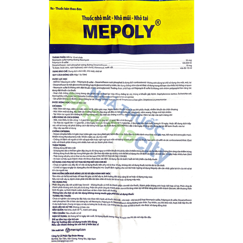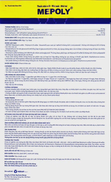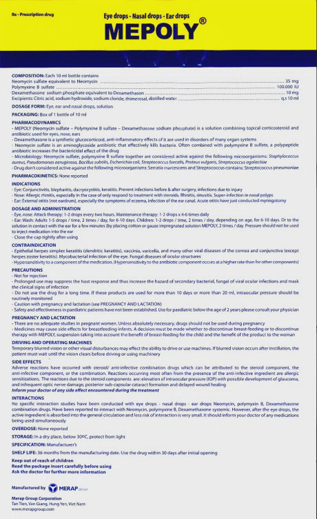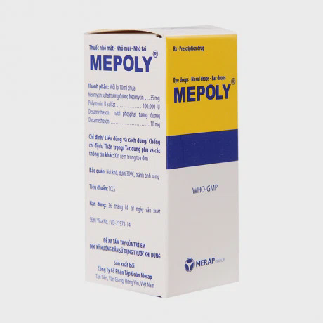 Thuốc nhỏ mắt, mũi, tai Mepoly của Công ty Cổ phần Tập đoàn Merap, chứa neomycin, polymycin B sulfat, dexamethason dưới dạng dung dịch nhỏ mắt, nhỏ mũi, nhỏ tai.