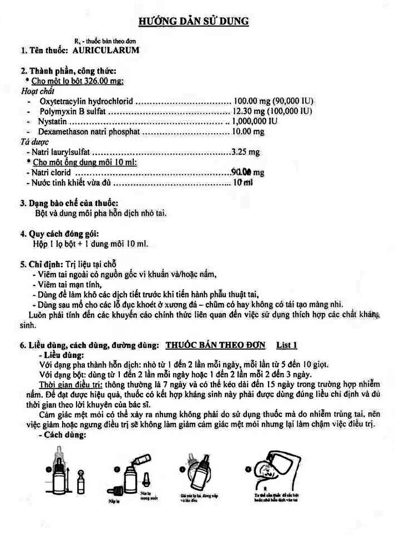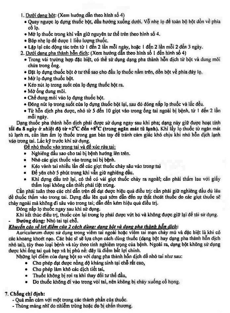 Từ hỗn dịch pha được, nhỏ từ 5 đến 10 giọt vào trong ống tai ngoài bị bệnh, từ 1 đến 2 lần mỗi ngày.