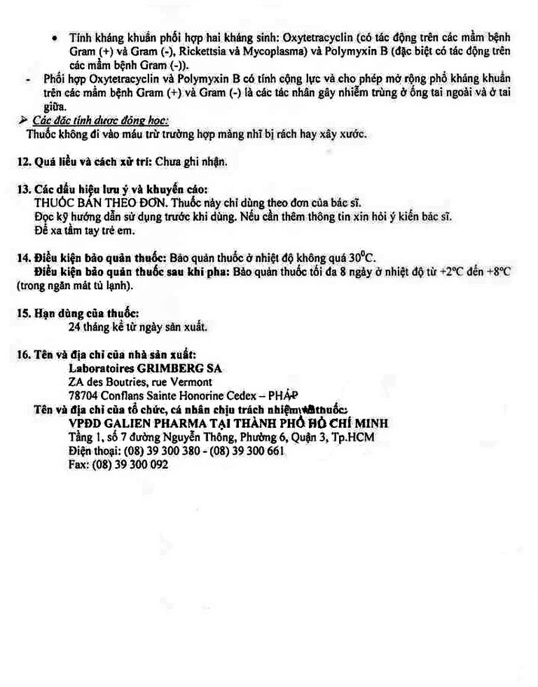 Phối hợp Oxytetracyclin và Polymyxin B Sulfatecó tính cộng lực và cho phép mở rộng phổ kháng khuẩn trên các mầm bệnh Gram (+) và Gram (-) là các tác nhân gây nhiễm trùng ở ống tai ngoài và ở tai giữa.