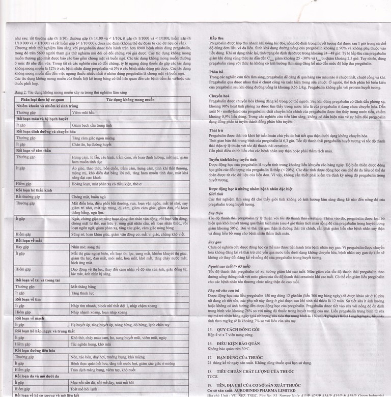 Pregabalin được hấp thu nhanh khi uống lúc đói, nồng độ đỉnh trong huyết tương đạt được sau 1 giờ trong cả chế độ dùng đơn liều và đa liều. Sinh khả dụng đường uống của pregabalin khoảng > 90% và không phụ thuộc vào liều dùng. Khi sử dụng nhắc lại, tình trạng ổn định đạt được trong khoảng 24 – 48 giờ. Tỷ lệ hấp thu của pregabalin giảm khi dùng cùng thức ăn dẫn đến Cmax giảm khoảng 25 – 30% và tmax bị chậm khoảng 2,5 giờ. Tuy nhiên, dùng pregabalin cùng với thức ăn không có ảnh hưởng lâm sàng đáng kể nào đến mức độ hấp thu pregabalin.