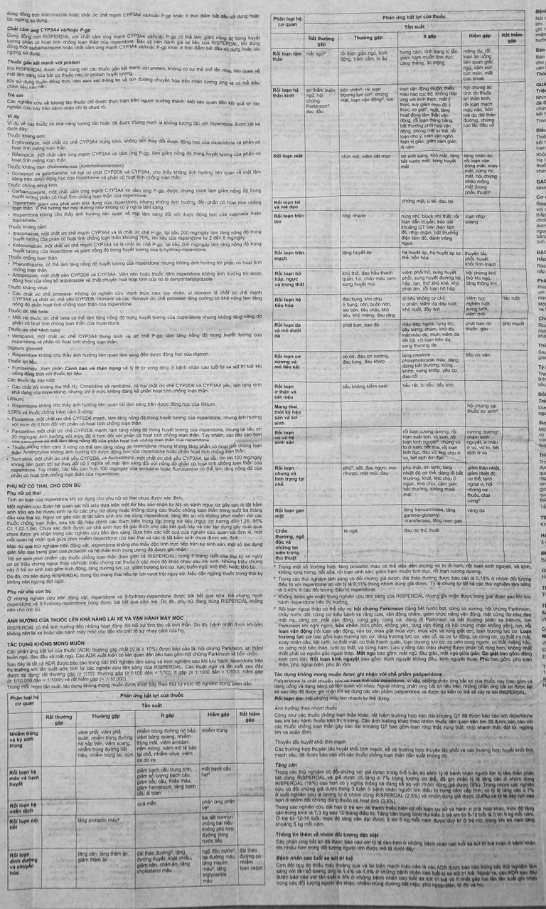 Ở bệnh nhân suy gan và suy thận: Bệnh nhân suy thận có suy giảm độ thanh thải phần thuốc có hoạt tính chống loạn thần hơn ở người lớn bình thường. Ở bệnh nhân có suy giảm chức năng gan, nồng độ risperidone tự do trong huyết tương gia tăng.