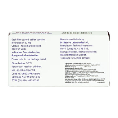 Thuốc Rivaxored 20mg Dr.Reddy’s: Phòng ngừa thuyên tắc huyết khối tĩnh mạch sau phẫu thuật thay khớp (Hộp 14 Viên)