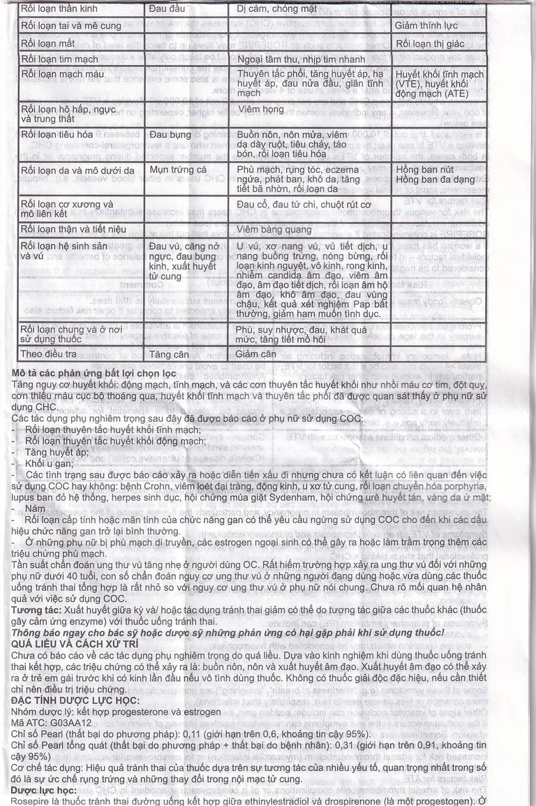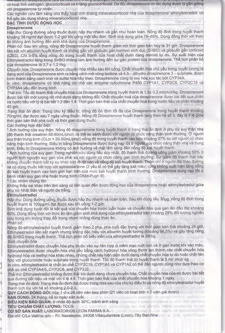 Thải trừ: Drospirenone được bài tiết một lượng rất nhỏ dạng không đổi. Chất chuyển hoá của drospirenone được bài tiết qua phân và nước tiểu với tỷ lệ 1,2 – 1,4. Thời gian bán thải của chất chuyển hoá khoảng 40 giờ. Nồng độ ổn định tối đa của drosperinone trong huyết thanh khoảng 70 mg/ml, đạt được sau 7 ngày uống thuốc.