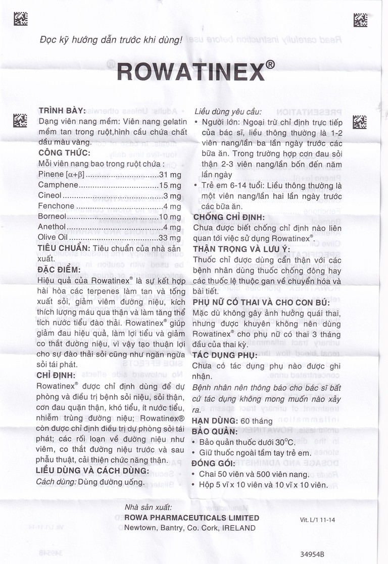 - Thuốc Rowatinex dự phòng và điều trị bệnh sỏi niệu, sỏi thận, cơn đau quặn thận, khó tiểu, ít nước tiểu, nhiễm trùng đường niệu.