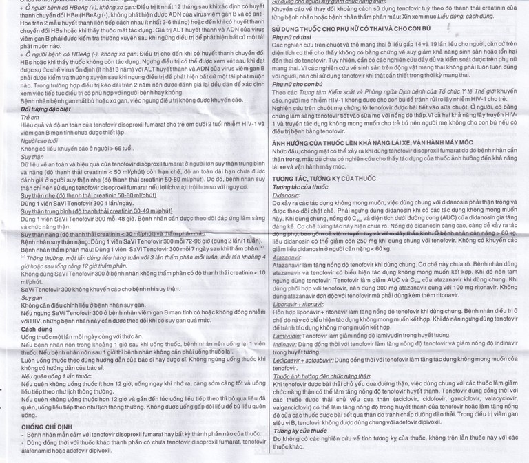 Nếu ngừng SaVi Tenofovir 300 ở người bệnh viêm gan siêu vi B mạn tính đồng thời có nhiễm HIV-1, phải theo dõi người bệnh chặt chẽ để phát hiện tất cả những dấu hiệu nặng lên của viêm gan. Điều trị phải do bác sĩ có kinh nghiệm. Nên làm một test phát hiện kháng thể kháng HIV-1 cho những người bệnh bị nhiễm virus viêm gan B trước khi bắt đầu điều trị bằng SaVi Tenofovir 300.
