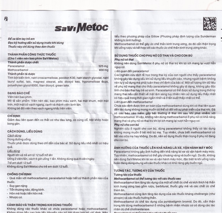 Paracetamol không gây ảnh hưởng đến khả năng lái xe và vận hành máy móc. Tuy nhiên, methocarbamol có thể gây choáng váng và buồn ngủ. Do đó, không nên dùng SaViMetoc khi lái xe và vận hành máy móc, đặc biệt là khi uống rượu hoặc đang dùng chung với các thuốc khác có khả năng gây buồn ngủ.