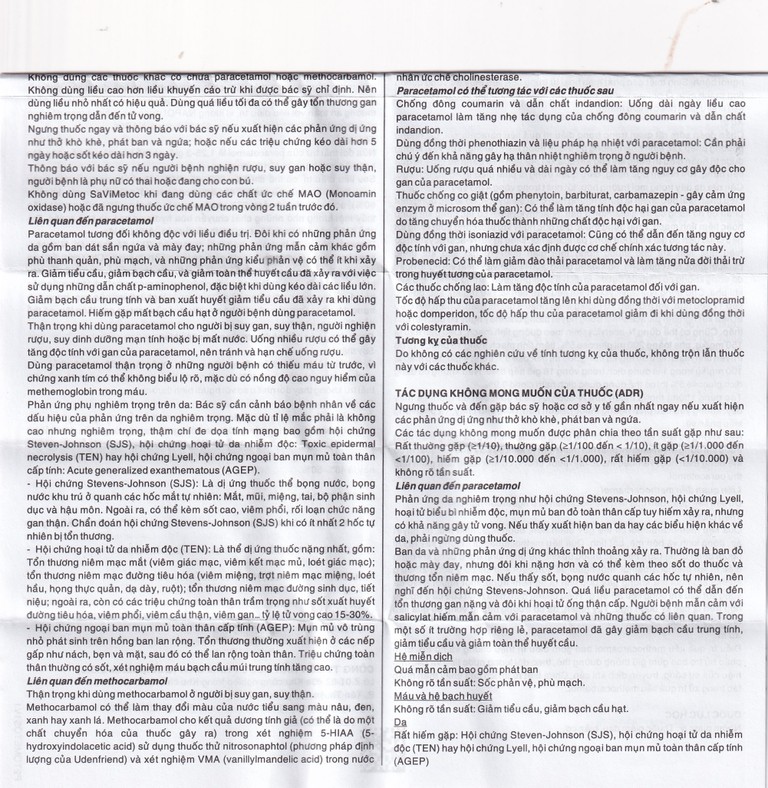 Không dùng các thuốc khác có chứa paracetamol hoặc methocarbamol. Không dùng liều cao hơn liều khuyến cáo trừ khi được bác sỹ chỉ định. Nên dùng liều nhỏ nhất có hiệu quả. Dùng quá liều tối đa có thể gây tổn thương gan nghiêm trọng dẫn đến tử vong.