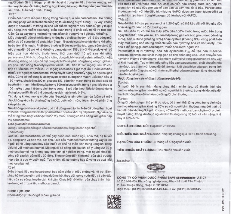 Tác dụng của thuốc dựa trên sự kết hợp giữa tác dụng giãn cơ của methocarbamol và tác dụng giảm đau hạ sốt của paracetamol. SaViMetoc làm tăng ngưỡng chịu đau, tăng lưu lượng máu qua da, giảm thân nhiệt, tăng tiết mồ hồi.