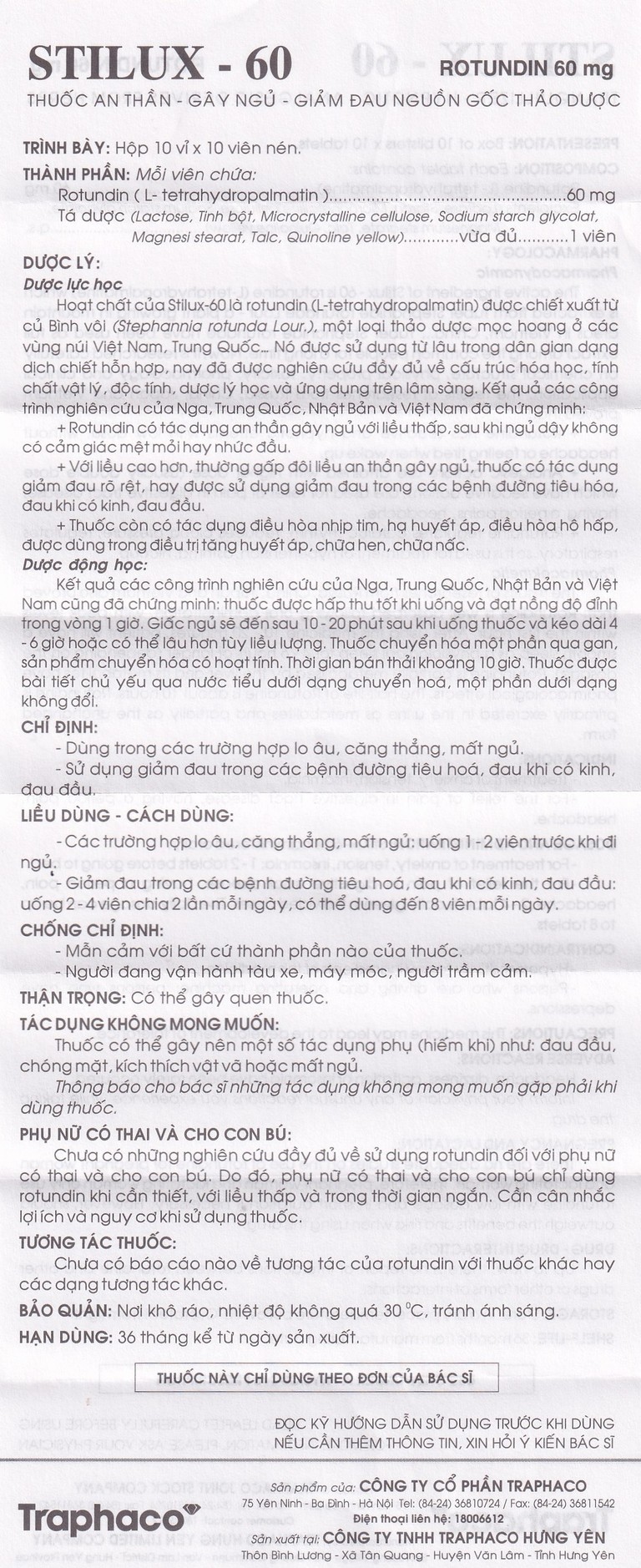 Thuốc Stilux-60 Traphaco dùng lo âu, căng thẳng, mất ngủ (10 vỉ x 10 viên)