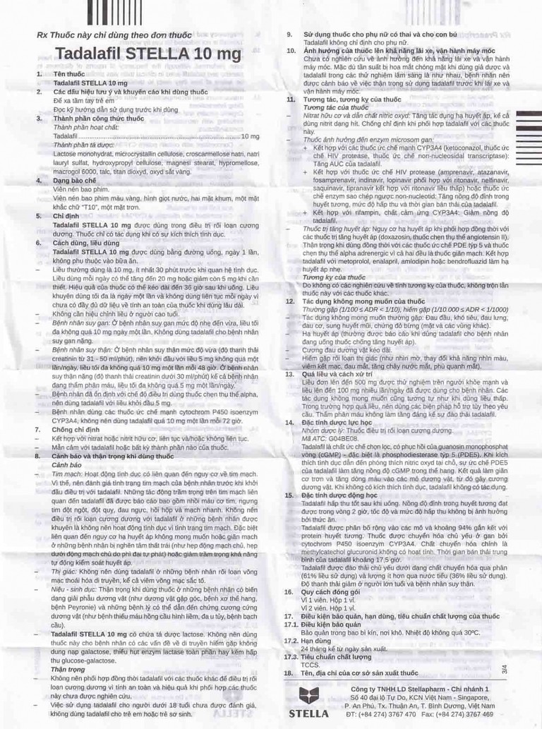 Tadalafil Stella 10 mg được dùng bằng đường uống, ngày 1 lần, không phụ thuộc vào bữa ăn.