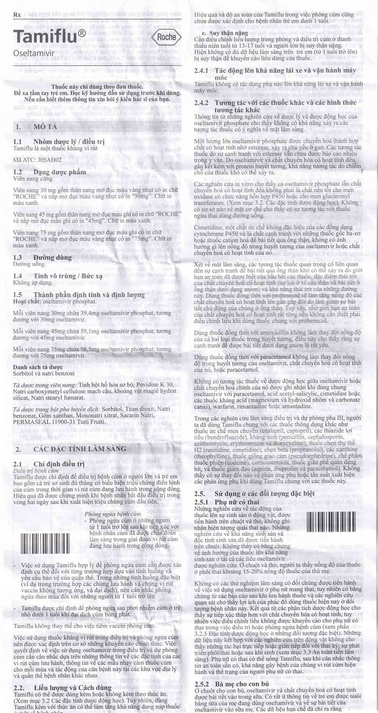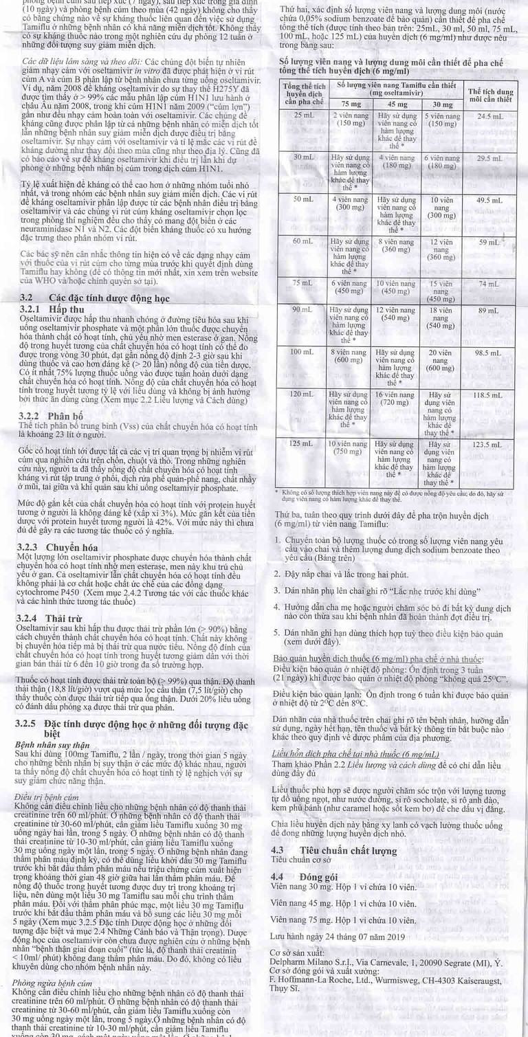 Người lớn, thanh thiếu niên 13 tuổi trở lên: Liều khuyên dùng 75 mg x 2 lần/ngày, uống trong vòng 5 ngày. Đối với trường hợp không nuốt được viên nang có thể dùng thuốc dạng huyền dịch với liều lượng tương tự.