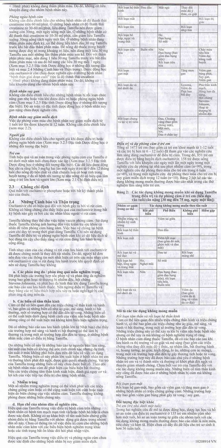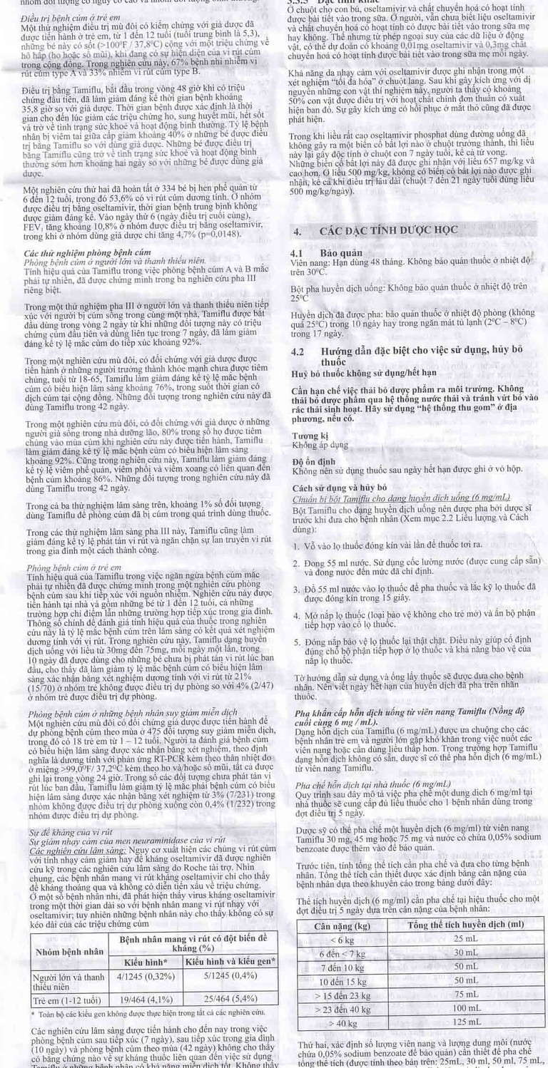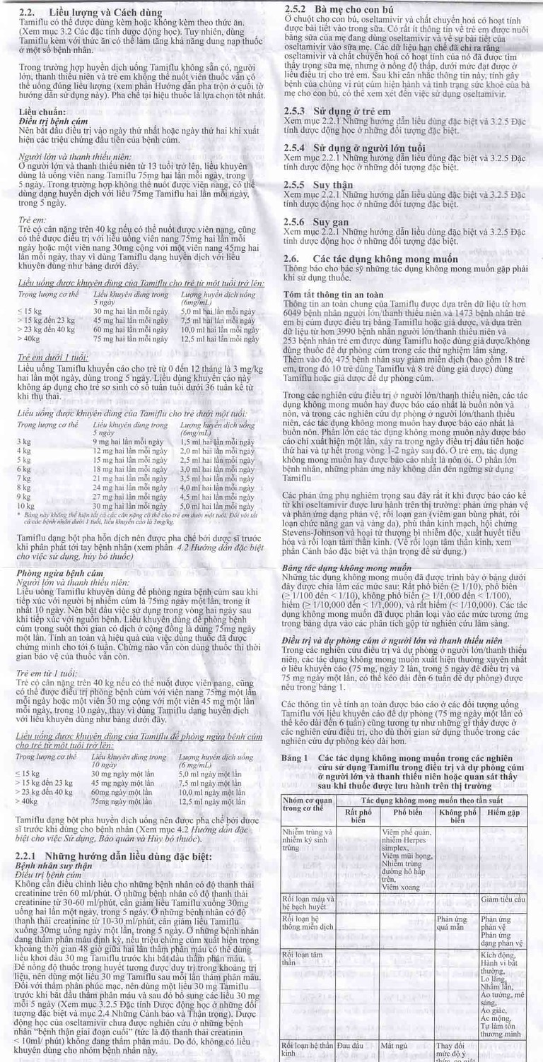 Liều khuyên dùng để phòng bệnh cúm trong suốt thời gian có dịch ở cộng đồng là 75 mg 1 lần/ngày.