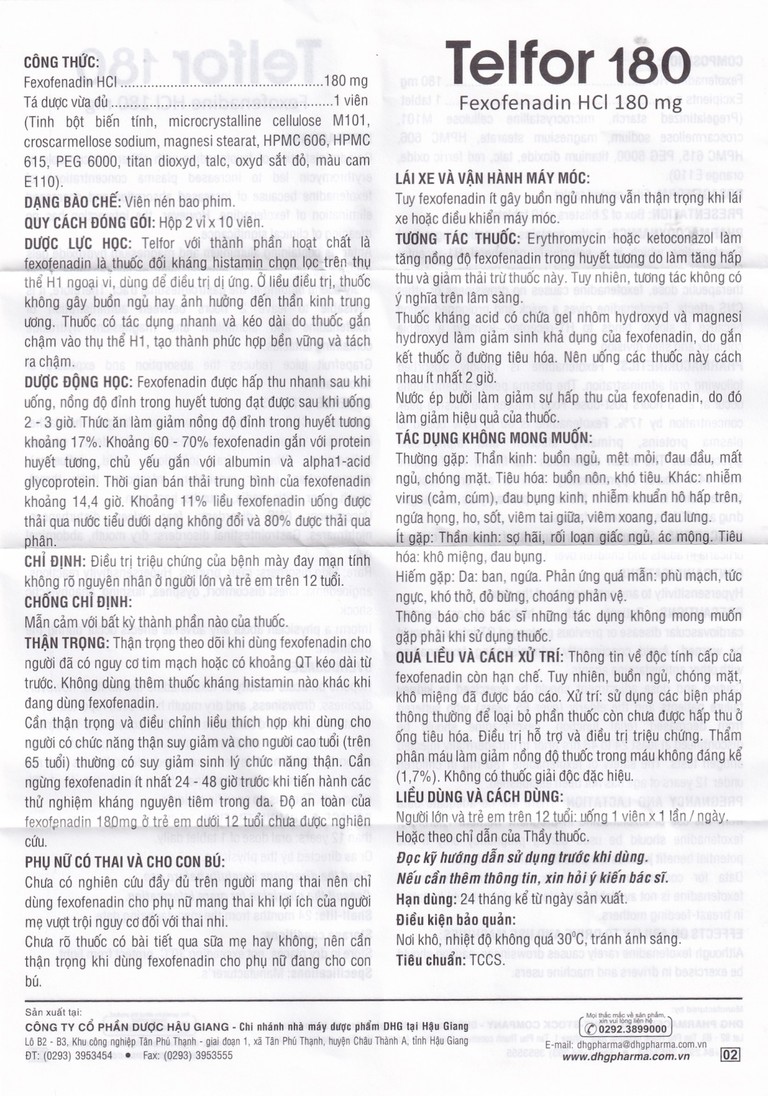 Thuốc Telfor 180 DHG điều trị triệu chứng của bệnh mày đay (2 vỉ x 10 viên)SẢN PHẨM