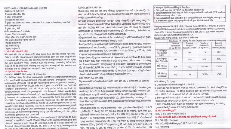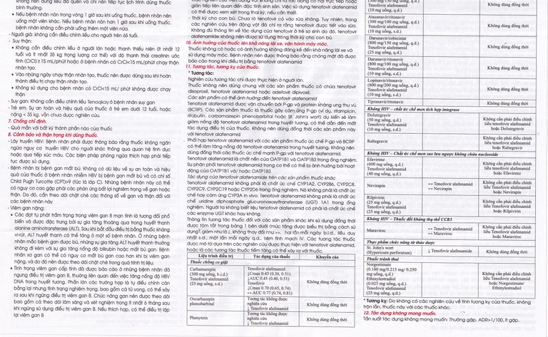 - Việc sử dụng thuốc mỗi ngày một lần ở bệnh nhân có CrCl ≥15 mL/phút nhưng < 30 mL/phút và ở bệnh nhân có CrCl < 15 mL/phút đang chạy thận nhân tạo dựa trên dữ liệu dược động học rất hạn chế, mô hình hóa và mô phỏng. Không có dữ liệu an toàn về việc sử dụng thuốc để điều trị bệnh nhân nhiễm HBV với CrCI < 30 mL/phút.