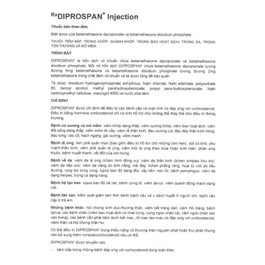 Diprospan Injection là chế phẩm phối hợp giữa hai ester của betamethasone có độ tan khác nhau trong nước, tạo nên hiệu quả kháng viêm, chống dị ứng và chống thấp khớp mạnh trong điều trị các bệnh lý đáp ứng với corticosteroid.